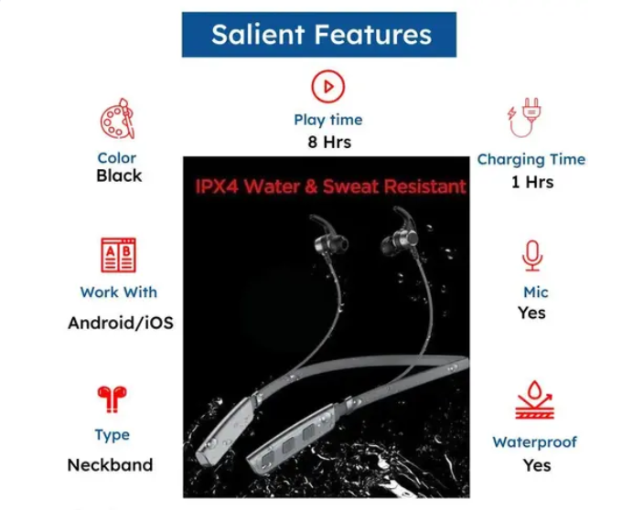 Name : Neckband True Wireless Bluetooth Earphones with 8 Hours Playtime & Compatible for all Smartphones (Black)