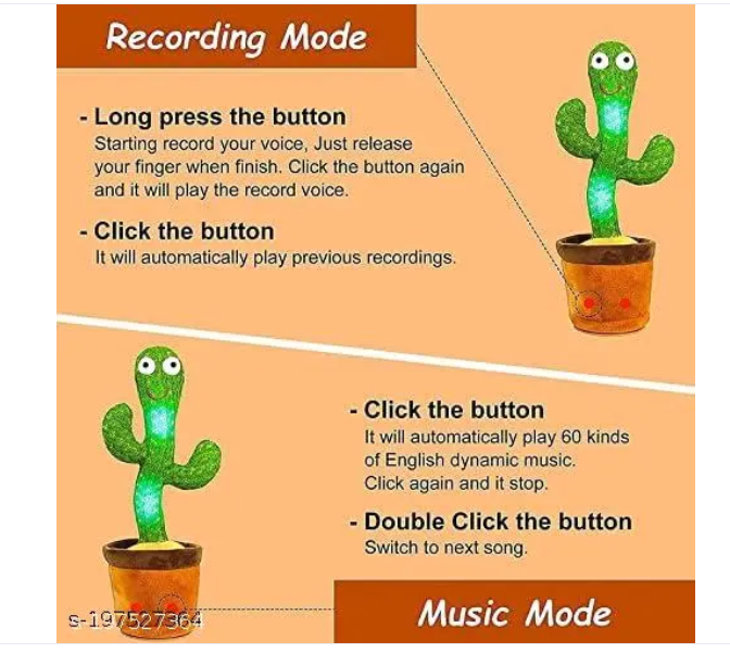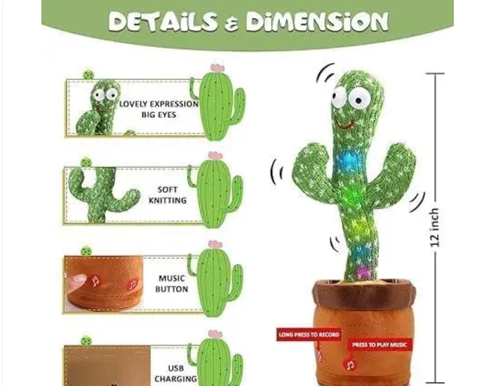 Trendy Cactus plush toy birthday gift for kids. Cheerful music and dancing are very suitable for creating a pleasant atmosphere and suitable for parties. Cute and fun cactus shaped plush toy can dance, sing, move, turn around. The toy will dance for a few hours, bringing the child a happy time in a life time. The toy can dance, sing, move, turn around. The toy will dance for a few hours, bringing the child a happy time in a life time. This cactus is equipped with a USB cable, as long as it is charged and the button is pressed, the cactus plush toy will swing and sing cheerful songs. The cactus plush toys is electronic shake dancing funny early childhood education toys. Upgraded Functions : There are upgraded number of English songs, with recording dialogue function (talking to the cactus, it can repeat your speech), with color lights (bringing light even in the dark night), dancing function, brand new upgraded function, which is more interesting and funnier. Safe Material: The plush cactus toy is made of soft material, which is comfortable, safe and non-toxic. Plush is absolutely safe for children. Fun and cute cactus plush toy, which can dance, sing, move, and bring children a happy time. Dancing Cactus plus toy.